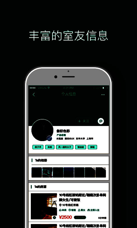 在这里,你不仅可以看到各位室友的地区和星座,还可以通过职业、兴趣、爱好和颜值找到真正与你兴趣相投的好室友,一起过上有趣的合租生活;