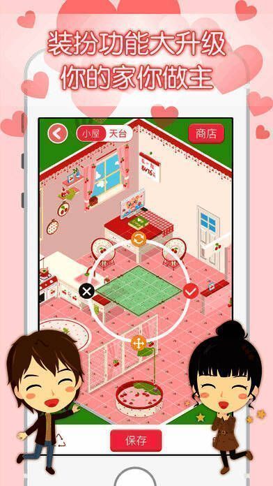 2、所有家具都有功能:日记本、地图、窗外天气、纪念日、相册、聊天。还可以打扮自己的卡通形象,随时亲亲抱抱,甜蜜互动。