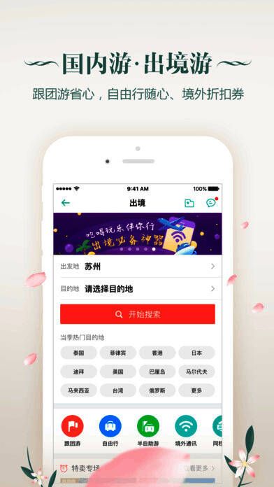 6、出境游:全球热门目的地旅游团预订、半自助游预订;跟团自助随便怎么玩;