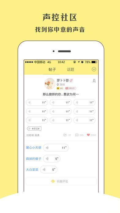 更加有趣的声音交友尽在《快声》!为你提供专业的声音交友平台!在这里你不仅能更众多陌生人聊天互动,还可以用声音了解你的聊天对象,让你的交友之旅更加真实有趣!