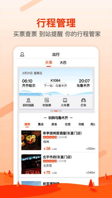 火车到站提醒、一键叫车、在线买票、目的地攻略、酒店、美食、周边游,应有尽有
