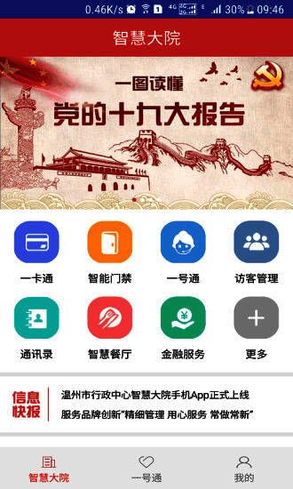 智慧大院APP上线,是市机关事务管理局与农行温州分行深度合作的成果。经过三年努力,先后建成了智能一卡通系统、房产管理系统、阳光厨房系统、智慧节能系统、智慧消防系统、智慧餐厅系统等十多个子项目,为后勤服务、保障、管理注入“智慧元素”。智慧大院APP更是成为同类项目中唯一通过安全等级保护测评认证的软件系统。推广后可以让更多的企事业单位享受便捷的通勤办公服务。