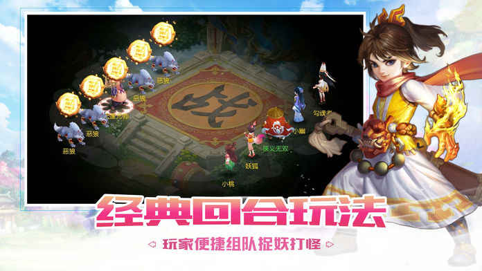 2、经典回合玩法,玩家便捷组队捉妖打怪;