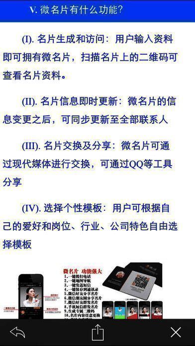 2、携带方便,可以使用手机转发,可以随时更新,由于是电子文档的格式,可以随时修改增删宣传内容,成本低,制作微名片,多媒体名片,微商微信所属名片功能,可以随用随做,无需最小订货量,减少资源浪费,客户索取样本,无需通过快递邮寄,转发其微名片就可以,展示企业创新意识,突出企业形象,设计精美,有交互菜单,在复杂的内容也会变得层次分明,浏览简单;