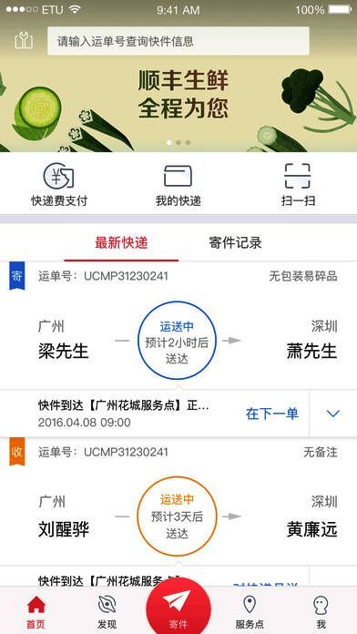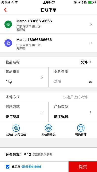 6、可从手机通讯录或顺丰地址簿中选择收寄件人电话、地址信息。
