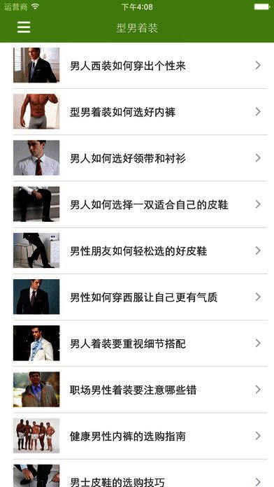 1、型男着装:职场男性事业为重,而良好的穿装打扮很重要,要穿着得体,让自己看起来更有气质,这样也会为自己的事业加分,很多男性朋友并不太擅长这方面,可以多看一看这方面的介绍,学习穿衣搭配技巧,这是人生成功的重要部分。