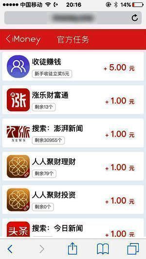 safari浏览器打开,下载助手。扫码成功后点击立即加入,出现二维码后再长按识别,关注imoney的官方微信。点击左下角安装imoney-跳转页面后点击右上角三个点,用safari打开。接着按照提示下载应用。用safari网页后点立即安装钥匙,安装好钥匙后再点击查看ios9安装方法,点立即设置信任该应用,之后打开imone激活钥匙。进入平台后点“官方任务”,对有余量的应用进行试玩下载,流程与小鱼赚钱,PP红包等应用一样,试玩之后获取收入。注意:做任务时,下载的应用与任务应用一样的图标,对上即可下载,与应用名称无关。
