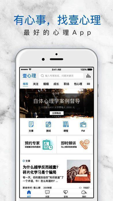 “壹心理APP”,国内最大的综合心理服务平台,你可以来读心理文章、做心理测试、学心理课程,听心理FM,提心理问题和约心理专家。国内外5000多位专业心理咨询师为你解决生活中各种心理问题,千万网友在平台上免费回答你的提问,陪你一起成长!