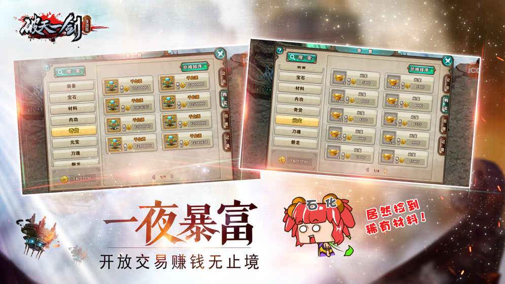 想要致富,又不知道该通过哪条途径?《破天一剑》手游带你走进致富之路,元宝寄售好交易,游戏也能赚大钱!《破天一剑》手游中的交易模式不通过拍卖行,不通过中间商,玩家之间自己就能自主定价,交易物品。便捷的交易环境,可是游戏中商人们不可或缺的必要条件。