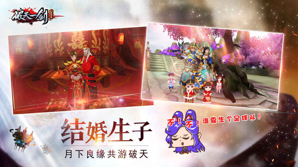 为你打造充满爱意的缘分江湖!夫妻系统全新上线,带你寻找另一半。喜车巡城,洞房花烛,此生只缘,只在破天。更有全新子女系统来袭,让你们拥有爱的结晶。萌娃陪你闯荡江湖,伴侣与你共度一生。快来寻找你的一生挚爱吧。