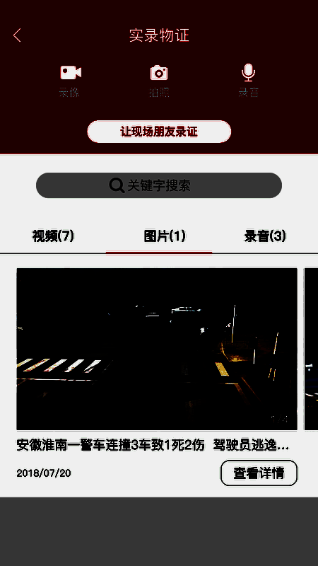 5、进入实录物证页面,选择让现场朋友录证,选择录像、拍照、录音。