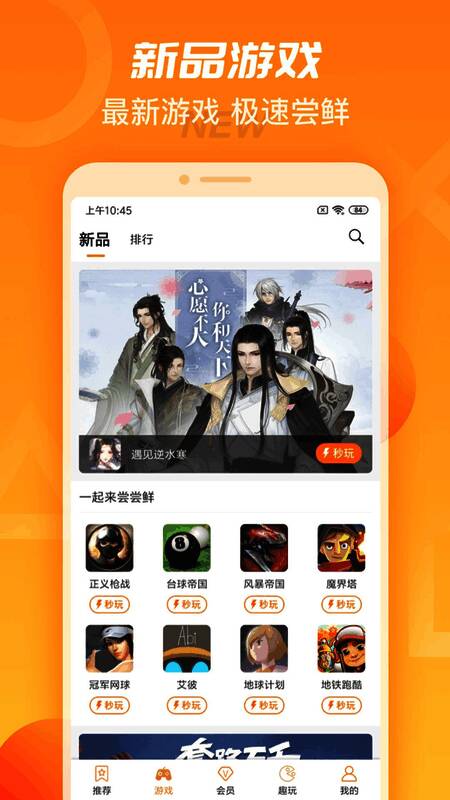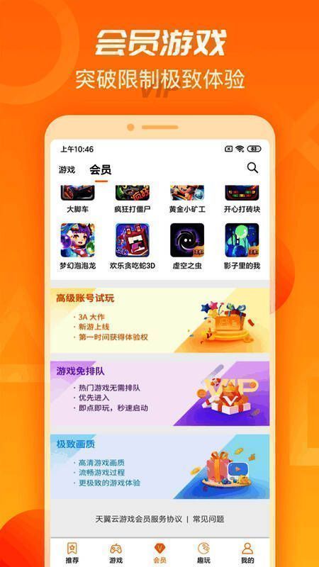 天翼云游戏app,由电信5G推出的一个游戏平台软件,为用户提供最新好玩的手游内容,用户可以获取免费的新游测试服务,享受第一手手游资讯资源,还能获取游戏礼包,让你轻松度过新手期。天翼云游戏,是一款为玩家精心打造的提供全网络接入、高清内容、多终端沉浸式体验的云游戏平台,让游戏玩家利用5G等高速网络,通过即点即玩的方式,免下载免安装,畅玩各类手机、主机优质游戏,随时随地快速便捷地体验游戏乐趣。