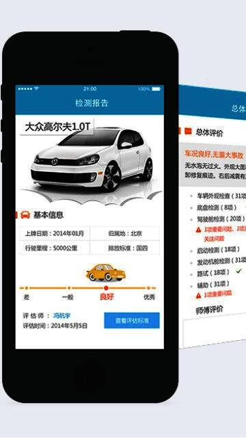 1、148项检测报告-“师傅看车”平台即时发送的评估报告,从车辆外观、底盘、启动、驾驶舱、一直到路试的148多项检测。