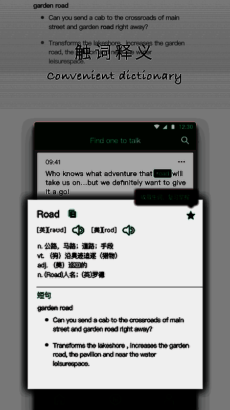 提供查词和翻译功能,支持语音翻译,快速加入单词本;阅读、图书、听力都可以进行点击词语进行翻译,结合单词本进行学习。