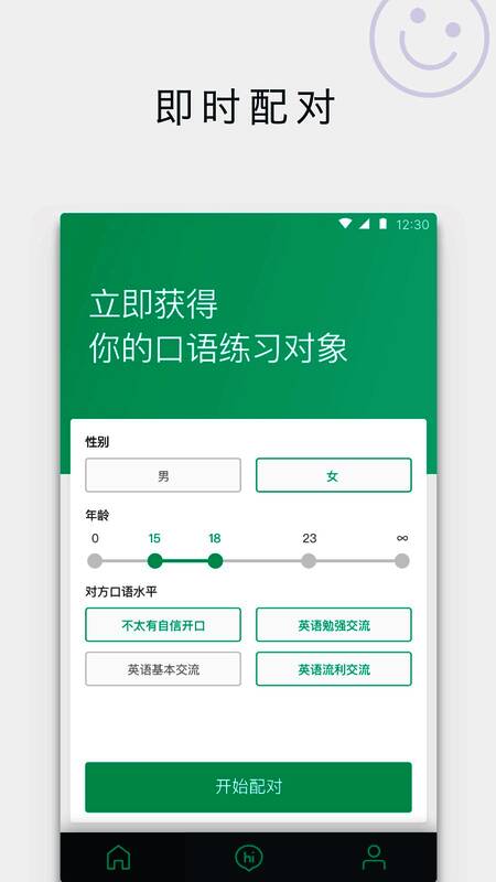 1、【配对语聊】最好的就是这个即时条件互相配对了,找个符合条件的童鞋谈生活谈理想吧!能不能碰上英语好的女神或男神,就看你人品了。
