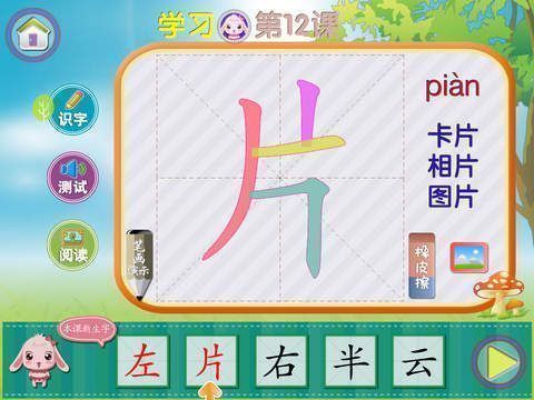 《趣趣识字第二册》是一款专为3岁以上儿童量身打造的识字学习软件。系列产品一共五册,合记800字。软件共有学习、测试、复习三大功能,通过笔顺、拼音、手写的方式教会孩子写字,然后再通过测试确认孩子是否掌握,最后再进行复习,确保孩子不会忘记学习过的内容。