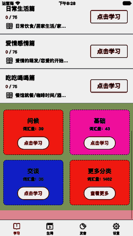 1、丰富词汇查看,比如说关于问候、交谈、基础词汇等,还有更多分类词汇等你来查看;
