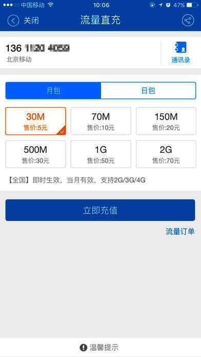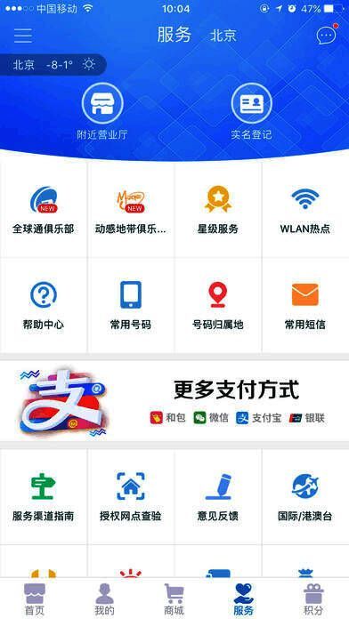 4、畅游移动商城:轻松办理4G套餐、流量加油包、积分兑换等业务,支持终端商品订购,助您精打细算、畅享移动体验;