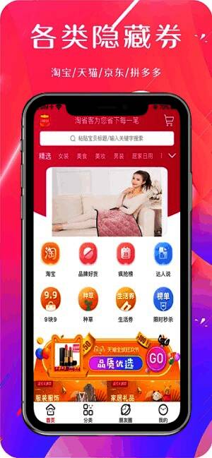 花最少的钱,买最优质的商品,想要优惠购物,就来淘省客。《淘省客》是一款非常不错的手机购物优惠软件。在淘省客软件内,拥有海量的优质的商品,繁多的商品种类,你想买的商品在这里都能轻松的搜索的到,而且还有相应的大额的优惠券可以领取,让你轻松享受到极致的省钱优惠购物,而且完成订单还有返利奖励可以领取哦。