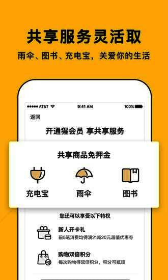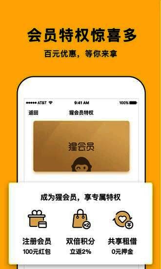 4、会员特权惊喜多:成为猩会员即返100元会员红包,购物可享双倍积分,共享租借免押金(仅限开业活动期间);