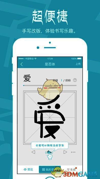 【造字】 书写100字即可生成个人字体,你书写中和生成过的字体更直观的呈现在你眼前,可以随时查看进度。