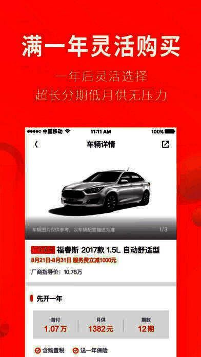 1、0到1成首付开新车,厂商直供热销车型,免购置税,送第一年保险;
