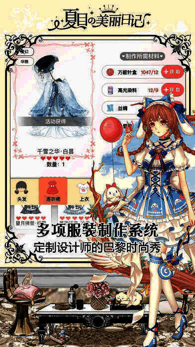 独特新颖的女性向恋爱换装手游《夏目的美丽日记》 跌宕起伏的主线剧情,性格各异的冒险伙伴! 在独创的恋爱玩法中,与性格迥异的少年(女?),创造独属自己的恋爱回忆。 不断增加和优化的服装搭配系统,让你的服装获得高分的同时更加赏心悦目~! 还有吃货最爱的烹饪游戏、百花争艳的时尚竞赛,种类丰富的裁缝小铺,琳琅满目的收集要素。各式各样的小游戏不断更新中….