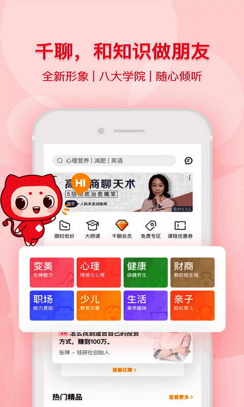 千聊app是一个专注于在线教育的直播软件,旨在为我们提供一种更为便捷的学习方式,千聊直播课程覆盖种类广,亲子、财经、养生、情感通通都有,而且平台兼容性好,完全适配微信直播,千聊app让你随身携带一个移动课堂。