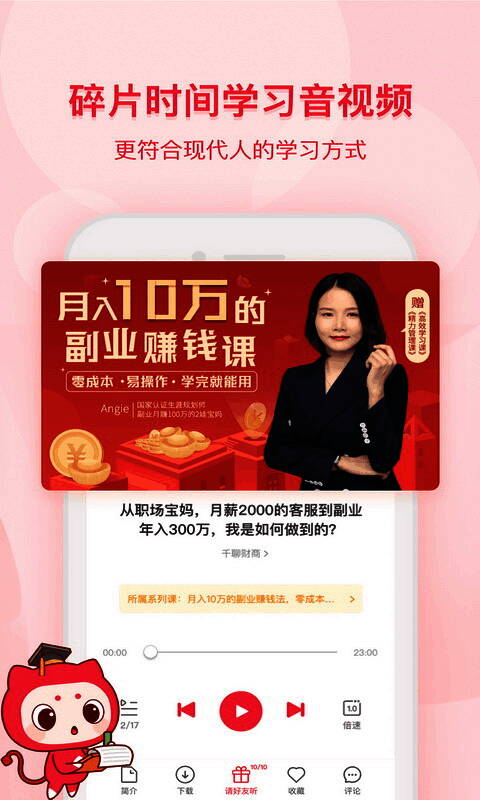4、后台收听:上下班路上、休息间隙、睡前、地铁上公交上、上厕所、边玩APP边听分享,节约宝贵时间给自己充电和学习,好好学习天天向上。