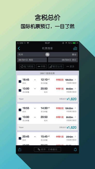 机票:全球各大航空公司及廉价航空公司上百万条国内和国际航班信息,海淘各类特价机票、打折机票、低价机票、国际机票,呈现含税总价,一目了然;
