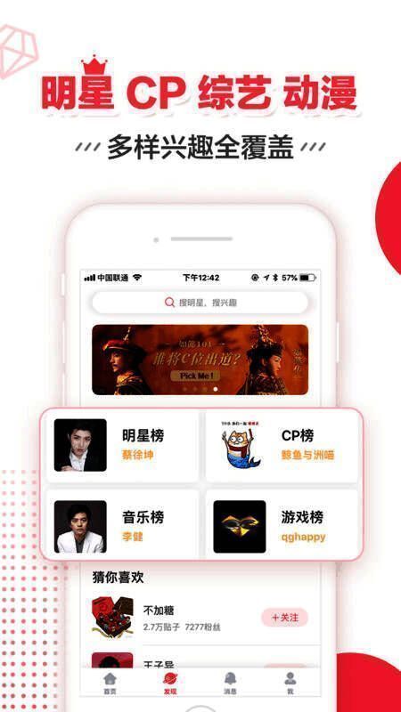 《超话社区》涵盖了从流行娱乐到专业领域的多个方向,涵盖明星艺人、热门CP、音乐剧目、电子竞技、动画作品、影视剧集、体育健将等多个维度。例如:
