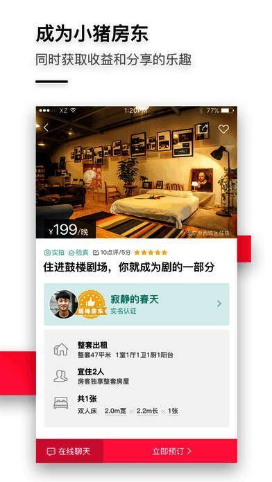 你可随时随地打开小猪APP,选择自己喜欢的特色房源或房间;