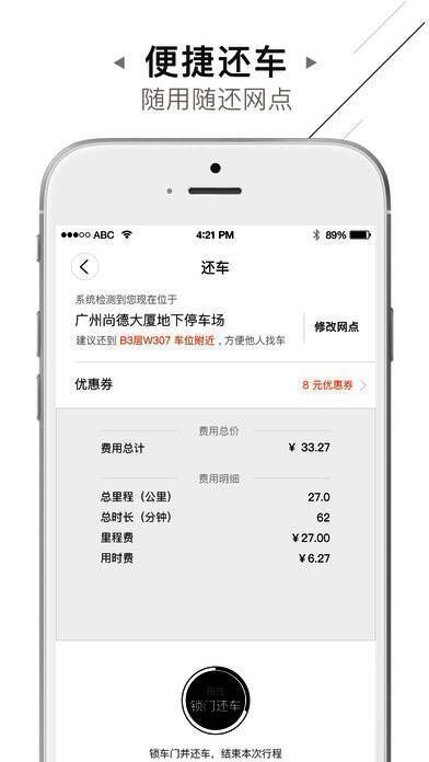 2、均无需用户负担油费电费,网点密布覆盖,全天随租随走,手机一键取还;