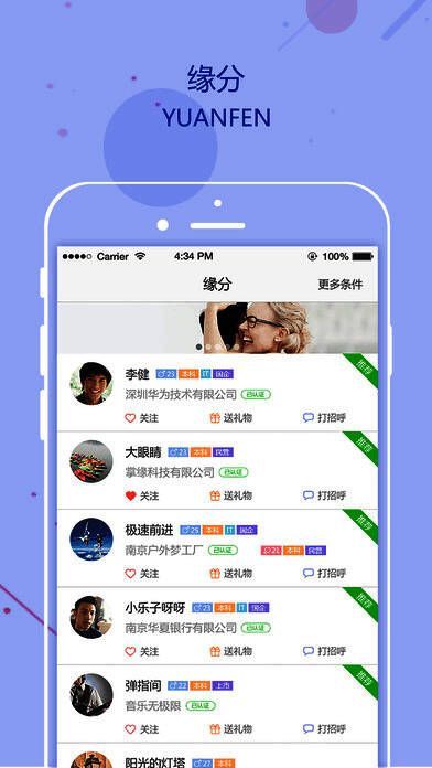 2、同时,创新性的将传统线下单位单身联谊会模式搬到了手机上来,让条件相当的单身群体实现“门当户对式”的交友。