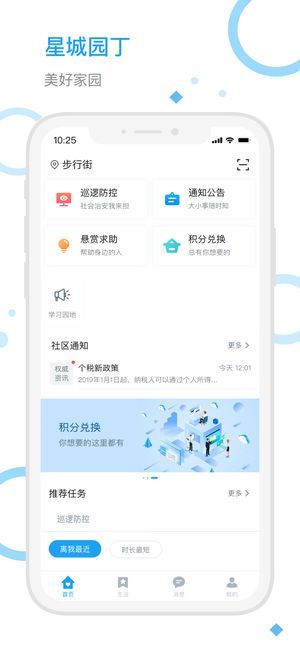 星城园丁软件目前总共有巡逻防控、交通违法举报、民众呼声、积分兑换四大核心功能。
