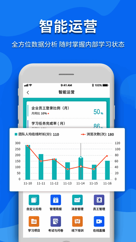 点击智能运营按钮,可以查看企业内部员工的学习情况;