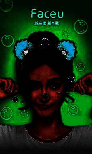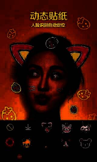 2、【动态贴纸】 猫须、腮红、兔耳朵动起来,动次打次普通的摇~。人脸识别贴纸自动跑到你脸上,瞬间让你萌萌哒;