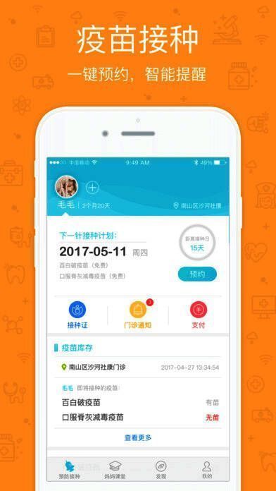 4、自主预约:在线预约宝宝接种日期,减少排队等待时间,省时省力;