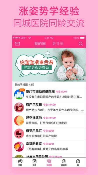 3、超人气圈子,方便妈妈交流:孕妈、辣妈们都爱的交流社区!求好孕、囤好货、涨姿势、学经验就往这里跑。