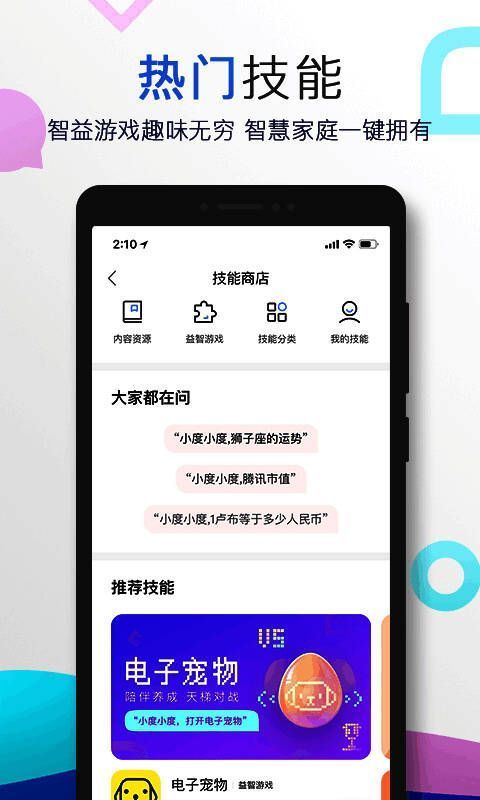 多种技能,涵盖游戏、生活等,周周更新;玩上这些技能,比地球上大部分人更早开始调戏人工智能,玩转小度新姿势。