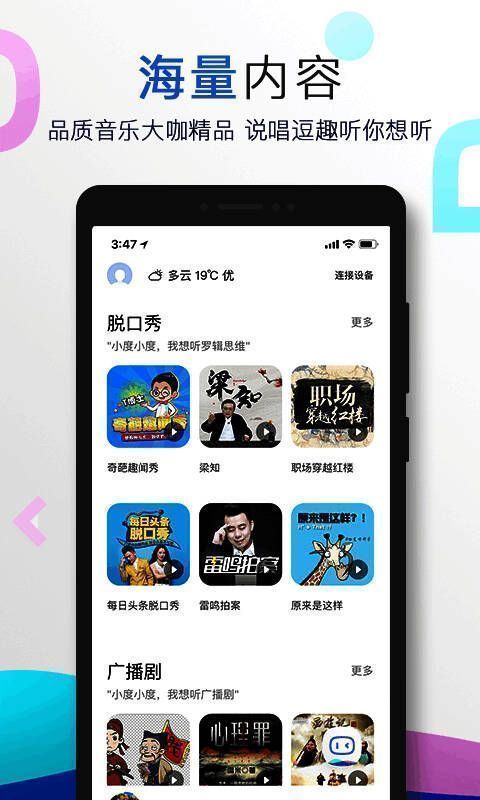好听的、好玩的、好笑的娱乐资源,一句话轻松get。还有小度电台智能推荐,音乐、脱口秀、相声、戏曲,总有一次戳中你,享受乐趣就这么简单。