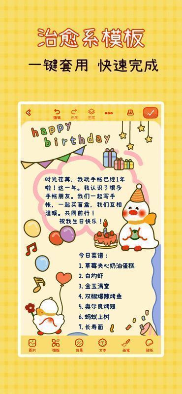 爱鸭手帐app下载这是一款能够帮助你记录生活的手账app。爱鸭手帐的界面设置清新可爱,每一个功能的LOGO都是可爱的小鸭子,并且软件还为用户提供了大量的免费贴纸,用户能够通过这款软件记录生活中的点点滴滴,不管是开心的还是难过的,你都可以记录下来。