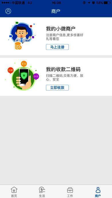 6、我的小微商户:支持客户通过APP注册成为银联小微商户,实现银联二维码收款功能。