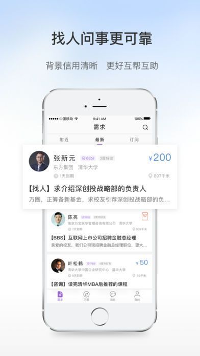 3、每条需求精准匹配万圈所有用户及用户能对外连接的其他可信的人脉,创新性的突破其他APP里因群组人数有限而无法有效解决的问题;