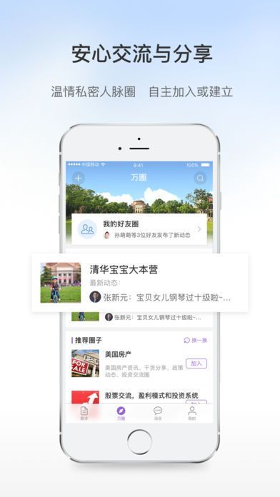 万圈,专为校友打造的实名社交分享平台。通过校友六度人脉关系和交叉验证来构建信用体系,可靠可信的社交渠道、和高效精准的知识经验分享平台。万能的校友圈,实名用户的桃花源。