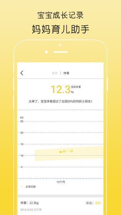9、添加宝宝的身高和体重后,系统自动生成宝贝的成长曲线并能跟国家标准数据做匹配提示身高和体重领先或落后全国小朋友平均值的多少;