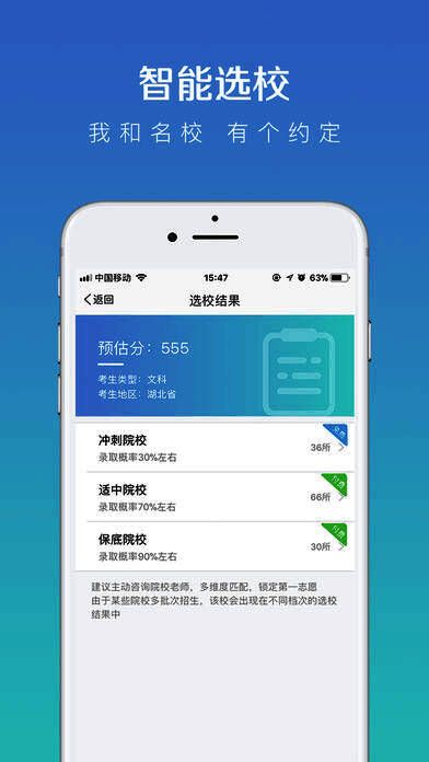 5、一键智能选校挑大学:高考前,输入预估分,采用线差法,帮你一键匹配出分数可以上的院校;高考后,输入高考分,采用业内最科学的同位分法,精准匹配出保底院校、适中院校、冲刺院校三种结果供你选择,学生再根据专业、城市的选择来进一步缩小大学范围,快速锁定目标大学;