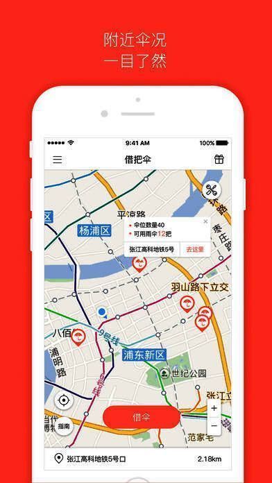 1、在「借把伞」App 上查看最近的智能伞桩,并根据地图指引来到智能伞桩旁边。