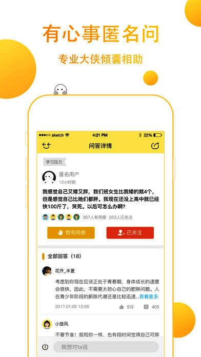 2、匿名提问,无所顾忌倾诉烦恼,比如“父母只关心我的学习成绩” “我暗恋上隔壁班的同学“ “父母离婚我不开心”等等……飞小凡上会有很多人第一时间回应你,帮你一起面对困难解决烦恼;