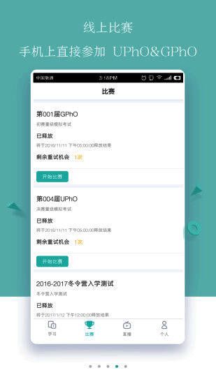 5、比赛:在手机上参加 UPhO 无压力,成绩优异的学员可获得各种线上及线下奖品;